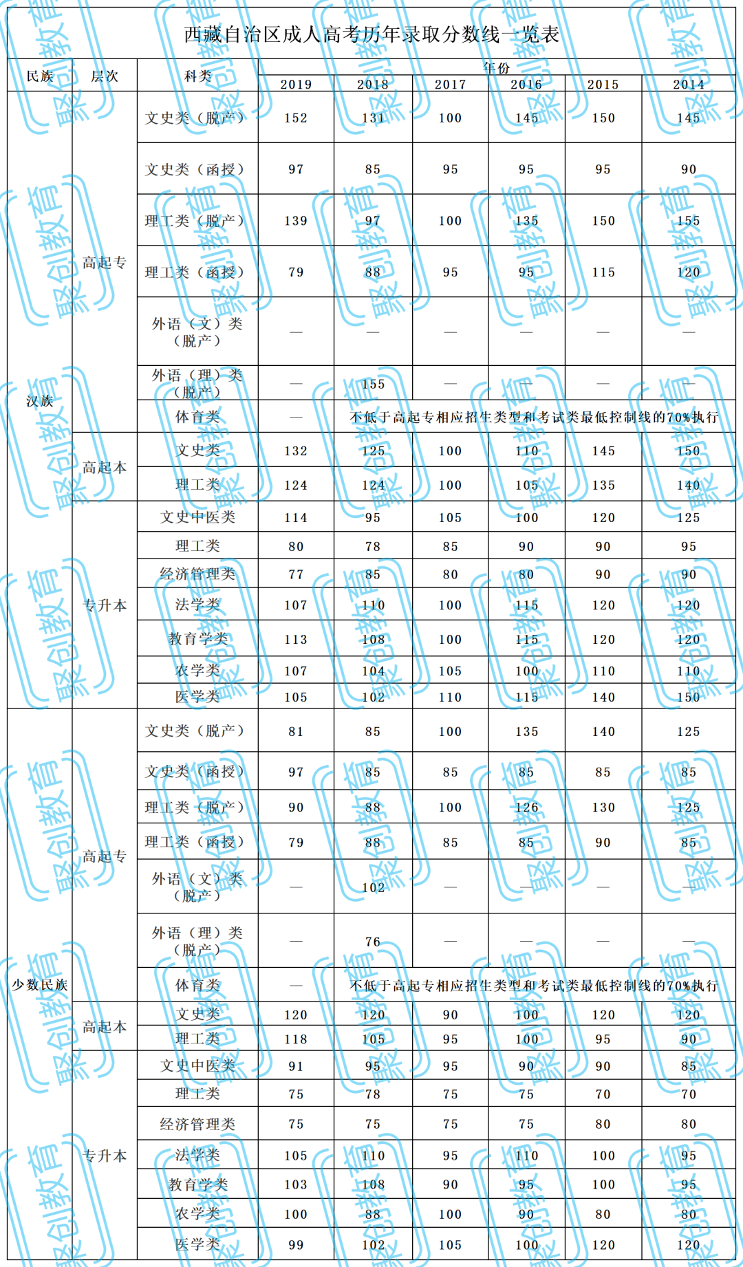 西藏自治区,少数民族的分数相对汉族会更低一些,且大部分专业均未超过100分,平均计算,每科成绩只需在30-40左右即可。
